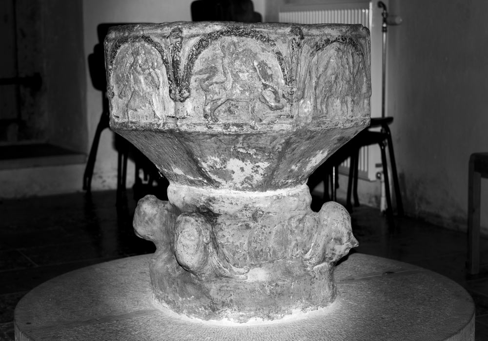 Blant relieffene på døpefonten kan man se fabeldyret Aspis, inntoget i Jerusalem, Samson i kamp mot løven, en bueskytter.