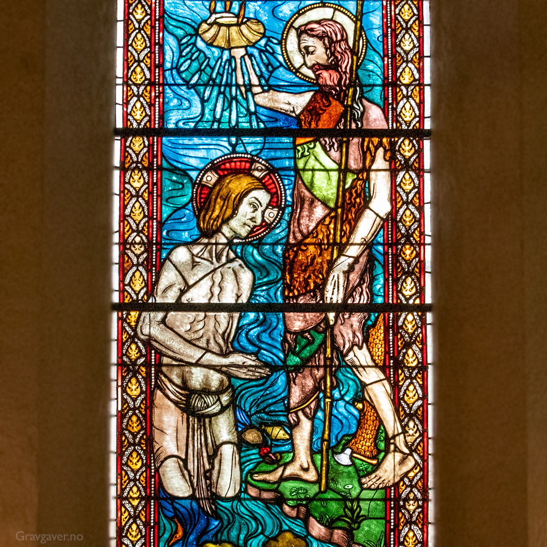 Glassmaleri i Oslo domkirke som viser døperen Johannes når han døper sin tremenning Jesus Kristus i Jordanelven.