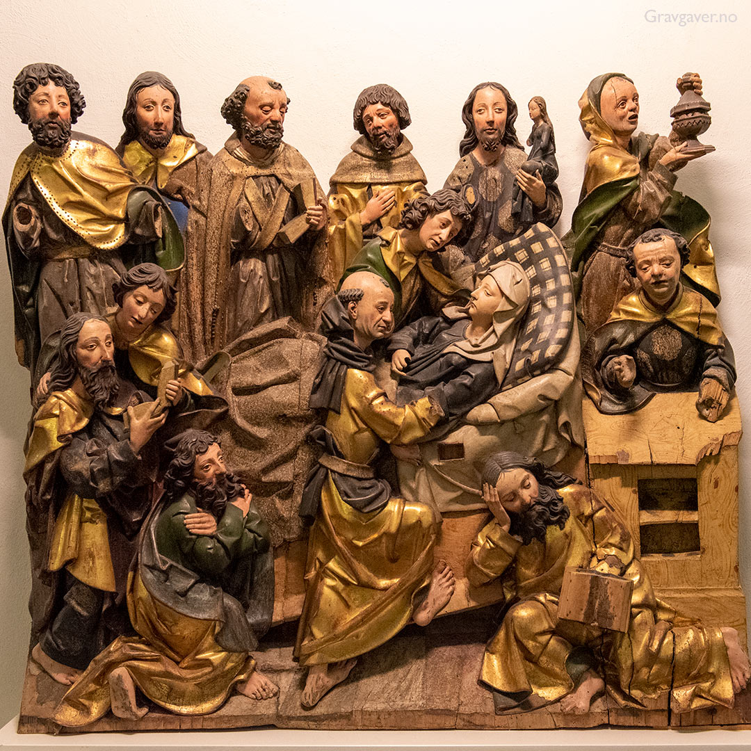 Marias død og himmelfart (1538, Gagini-skolen) i kirken Santa Maria delle Scale i Ragusa på Sicilia. Farget terracotta.